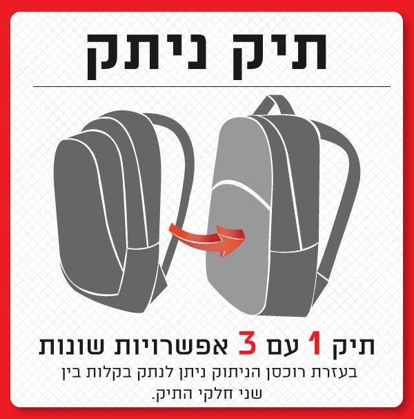 התיק יכול להתחלק לשני תיקי גב נפרדים – תיק קטן ותיק ראשי.