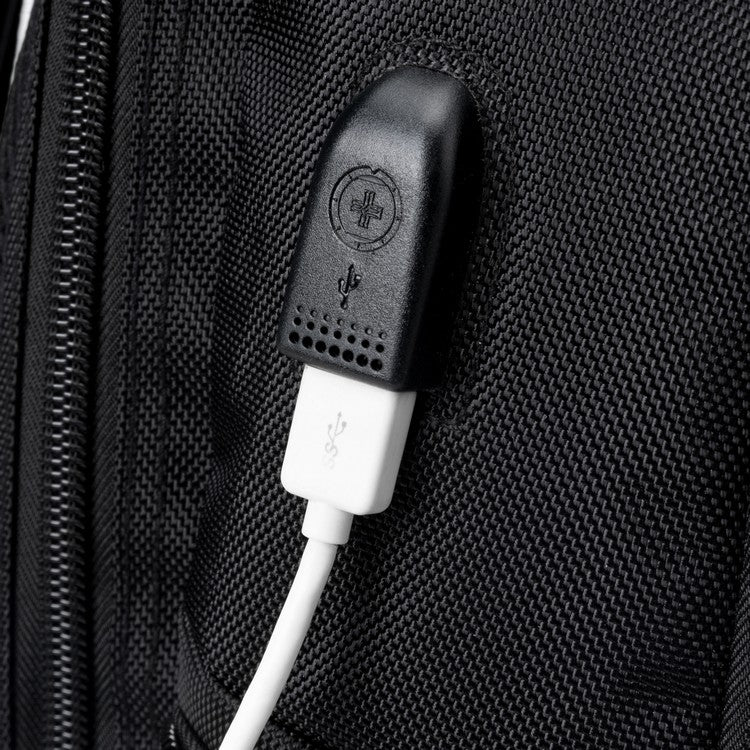 שקע כניסת USB חיצוני לטעינה מהירה , 2 תאי רוכסן מוסתרים בצידי התיק ,כיס רוכסן עליון לשליפה מהירה, רצועה חכמה מתלבש על ידית טרולי , רצועות גב נוחות , ידית נשיאה עליונה.