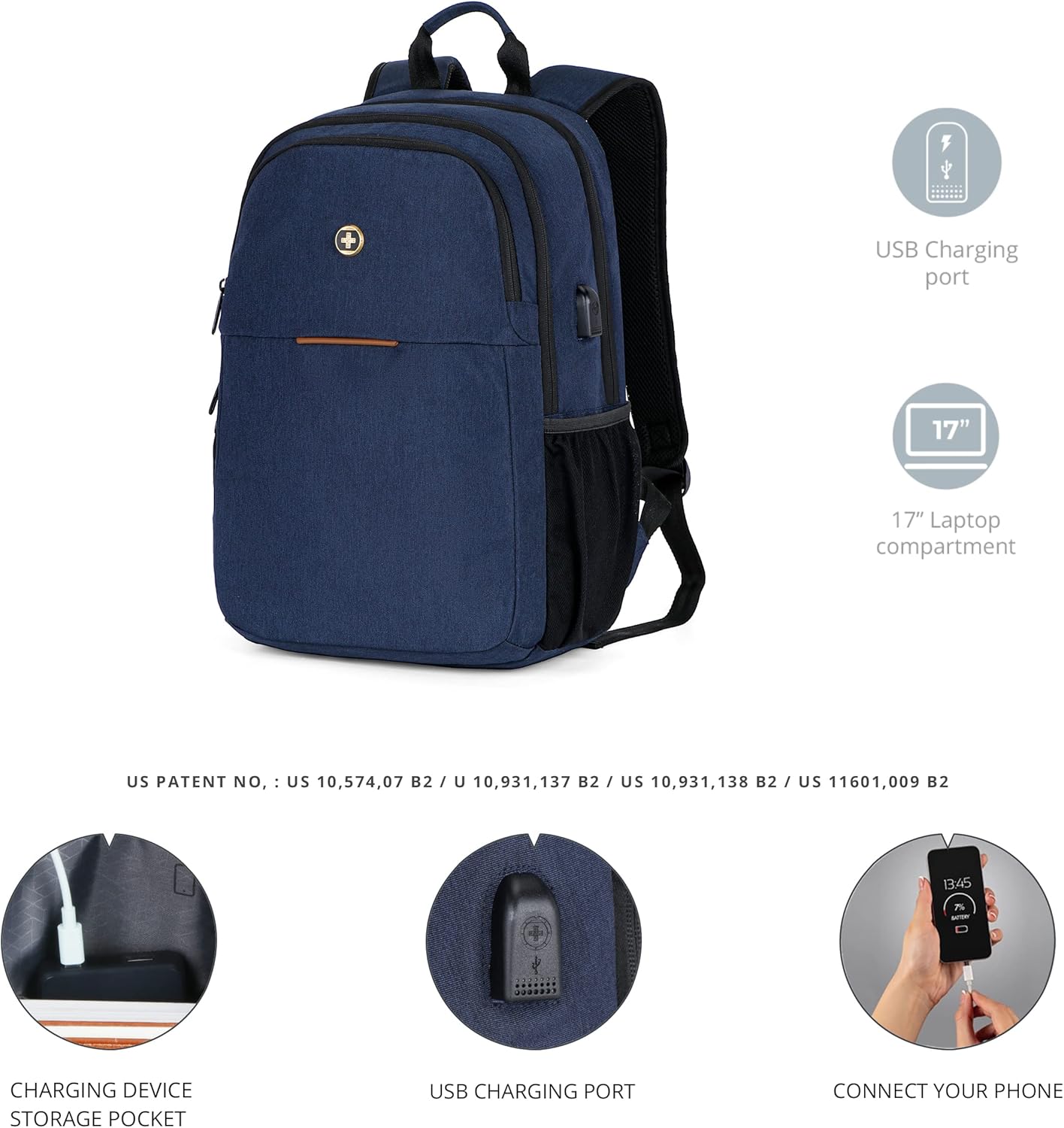 שקע כניסת USB חיצוני לטעינה מהירה , 2 תאי רוכסן מוסתרים בצידי התיק ,כיס רוכסן עליון לשליפה מהירה, רצועה חכמה מתלבש על ידית טרולי , רצועות גב נוחות , ידית נשיאה עליונה.
