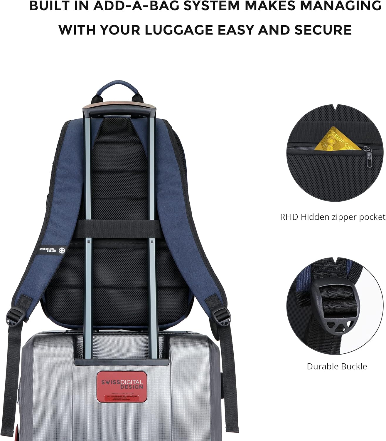 תיק גב יוקרתי ומוקפד מבית Swiss Digital, המתאים למחשב נייד עד 17 אינץ', מציע שילוב מושלם בין עיצוב מקצועי לנוחות יומיומית. כולל חיבור USB-C לטעינה נוחה, כיס הגנת RFID לשמירה על פרטיות, חלוקת תאים חכמה וחיבור ייעודי לידית מזוודה לנוחות בנסיעות. עשוי מחומרים עמידים ואיכותיים לנשיאה ממושכת – הבחירה המושלמת לעבודה, לימודים ונסיעות עסקים.